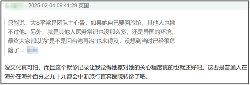 还有人想甩锅国外医疗,但大S有钱有名,一家子明星,医疗再差能差到哪去?