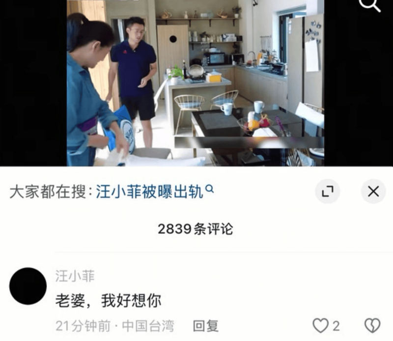 2月4日,网友发现汪小菲的个人社交账号在他和大S参加的综艺节目《幸福三重奏》切片下面留言“我好想你”。