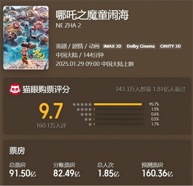 现在《哪吒2》票房来到了92亿元,预测票房更是达到了令人瞠目结舌的160亿。