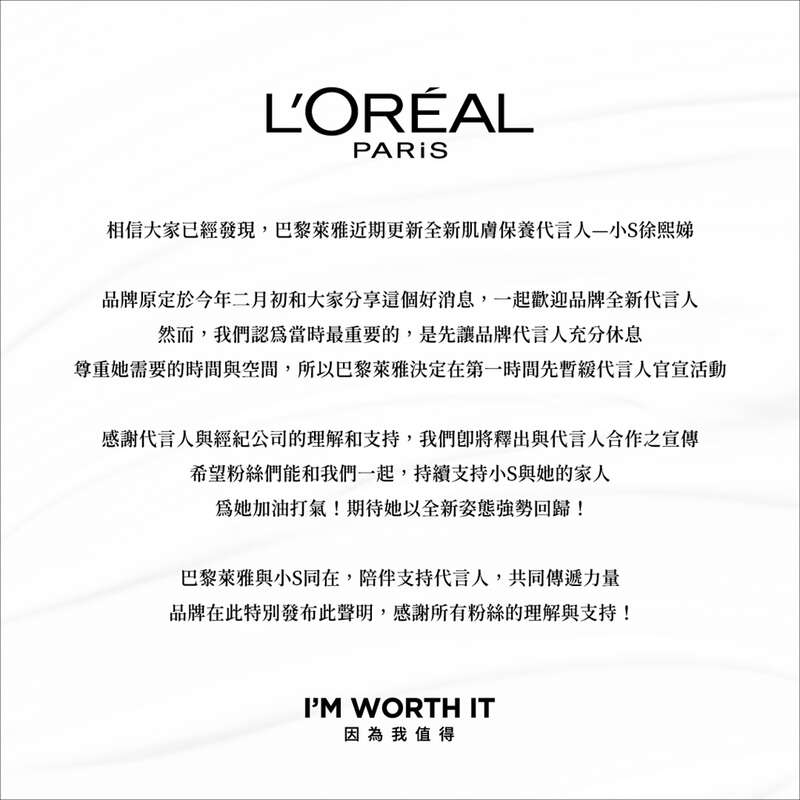 巴黎欧莱雅声明如下:相信大家已经发现,巴黎欧莱雅近期更新全新肌肤保养代言人一小S徐熙娣。