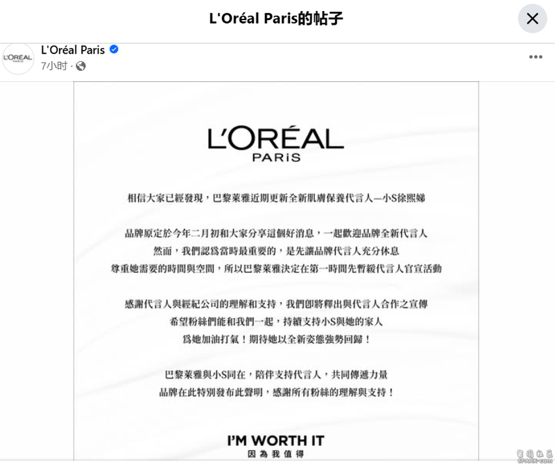巴黎欧莱雅今发声明。 (图/翻摄自L’Oréal Paris脸书)