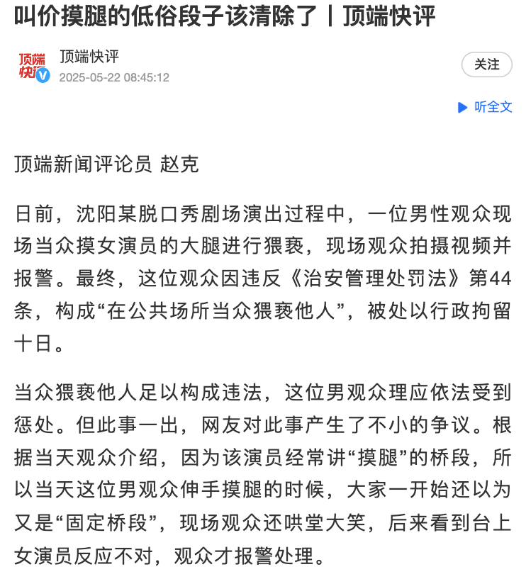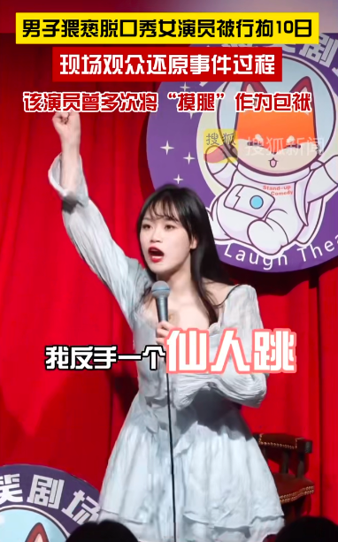 沈阳脱口秀现场,一个男观众拍了一下女演员的大腿,被行拘了10天。相关报道称: