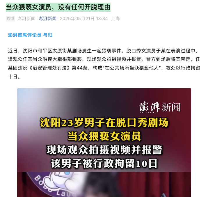 澎湃新闻的评论标题是《当众猥亵女演员,没有任何开脱理由》。