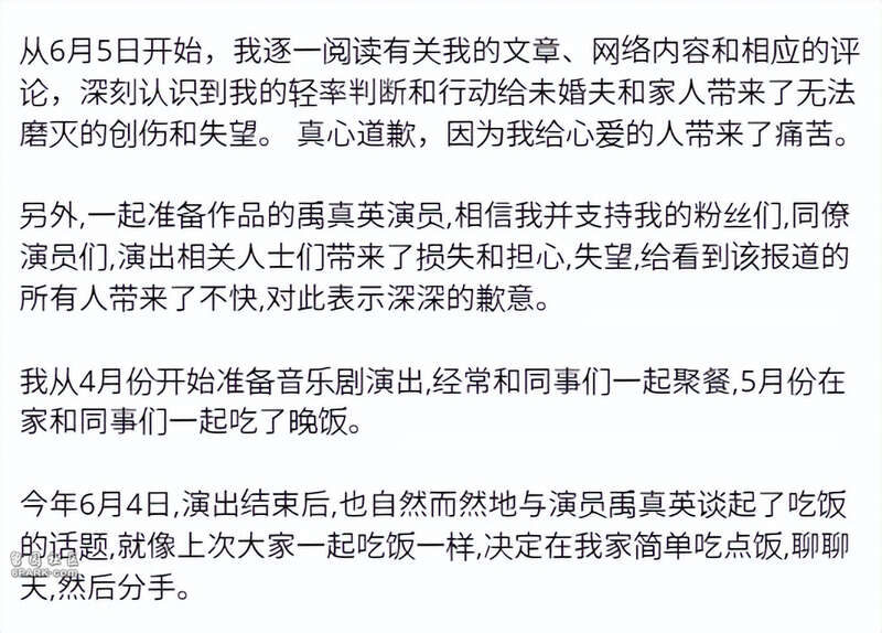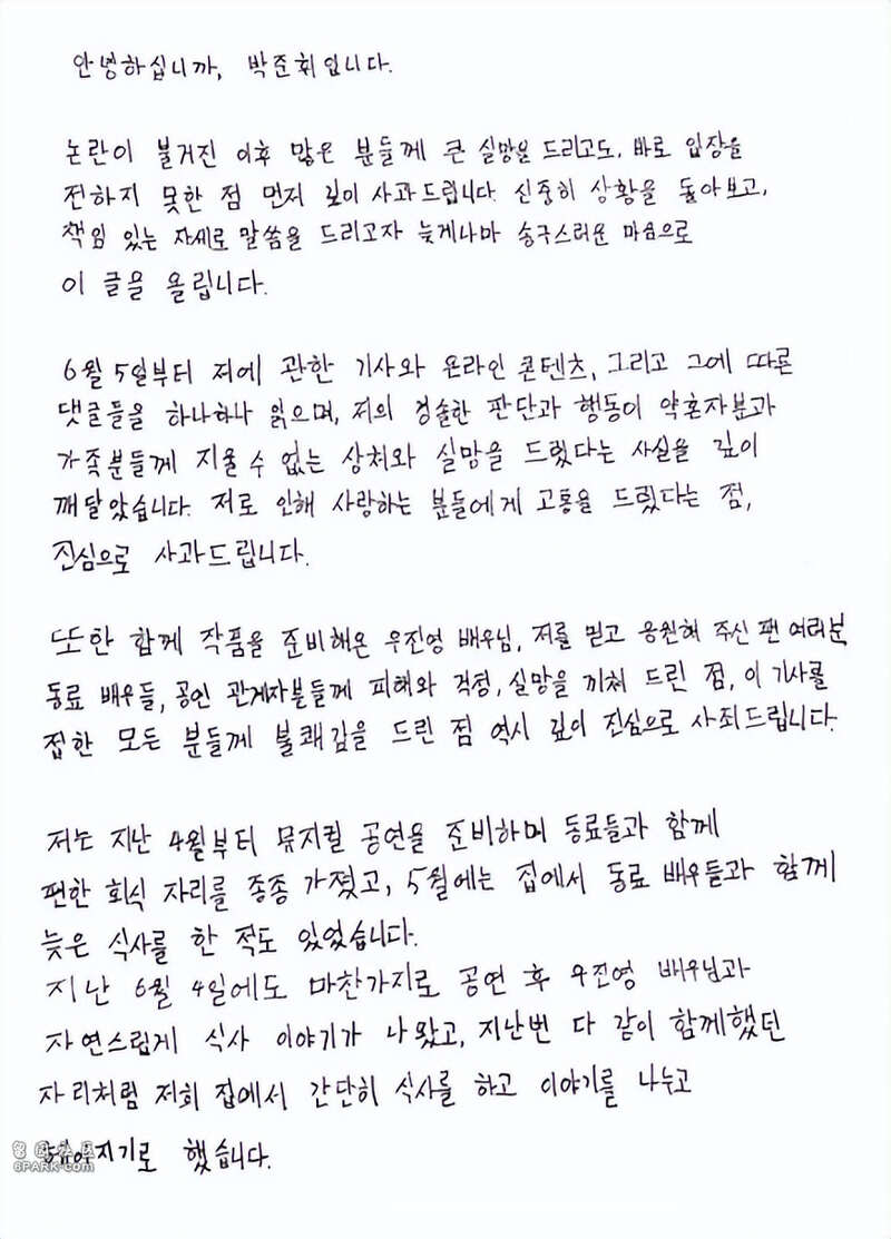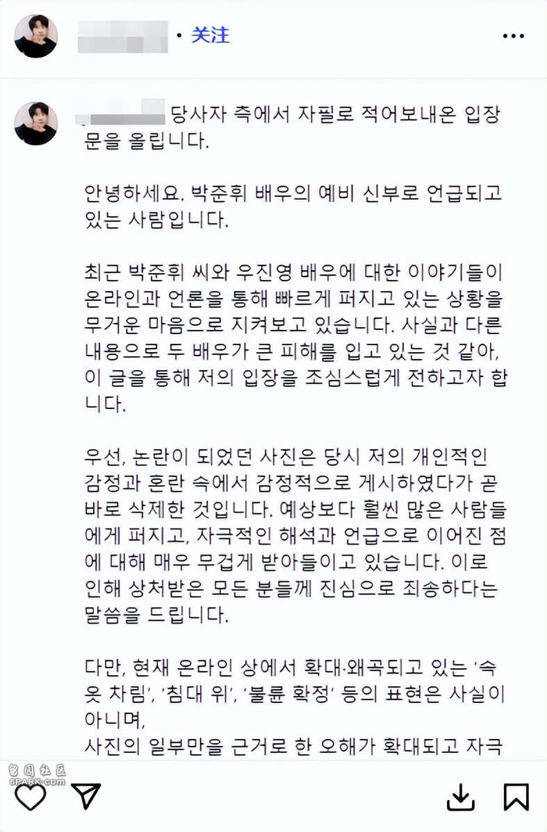 朴竣辉在文中表示,争议爆发后给很多人带来失望,没能及时回应首先道歉,称6月5日以来看到了网络上的批评,认识到自己的轻率行为给未婚妻和家人带来痛苦。
