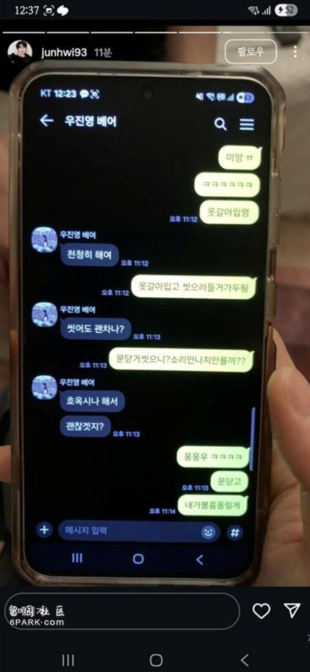 除了那张照片,未婚妻曾晒出两人聊天截图,当时疑似禹真英在男方家中洗澡,未婚妻突然闯入,继而引起出轨争议。