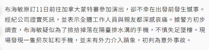 经纪公司证实死讯,布海敏在周四坠亡,疑似是为了捡起掉落在阳台排水沟的手机,结果不慎失足坠落,现场发现一个烟灰缸和手机,没有外力介入,排除他杀。