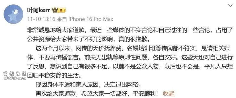 11月10日,叶珂发文回应近期传闻,称网传的天价抚养费,名媛培训班等传闻都不符实。前夫无出轨等原则性问题,各自安好。同时,她宣布退网,并注销账号。“现因身体不适和家人原因,决定退出网络。”