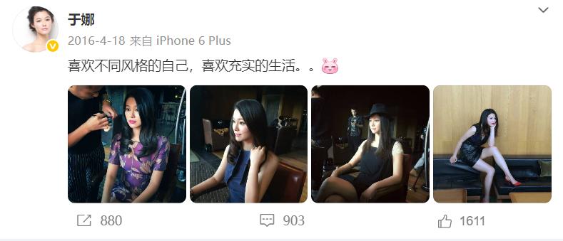 于娜在微博最后一次更新照片是在2016年,她分享4张照片并称“喜欢不同风格的自己,喜欢充实的生活。”