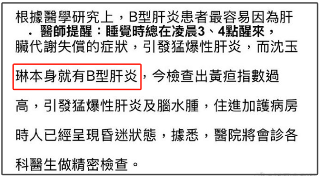 而沈玉琳本身就有B型肝炎,最容易因为肝脏代谢失常引发猛爆性肝炎。据悉,他检查出的是黄疸指数过高引发了猛爆性肝炎和脑水肿。