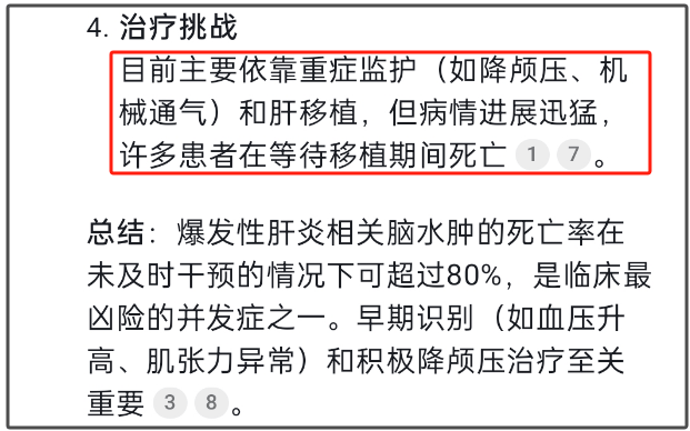 猛爆性肝炎就是猛爆性肝衰竭,是由肝细胞短时间内大量坏死引发致命性肝功能衰竭,病情进展迅猛,患者容易出现肝昏迷或者脑死亡。据悉,相关病症死亡率高达80%,主要治疗措施是靠ICU降颅压和肝移植,很多病友在等待移植期间死亡,沈玉琳目前还在ICU看护,具体情况不明。