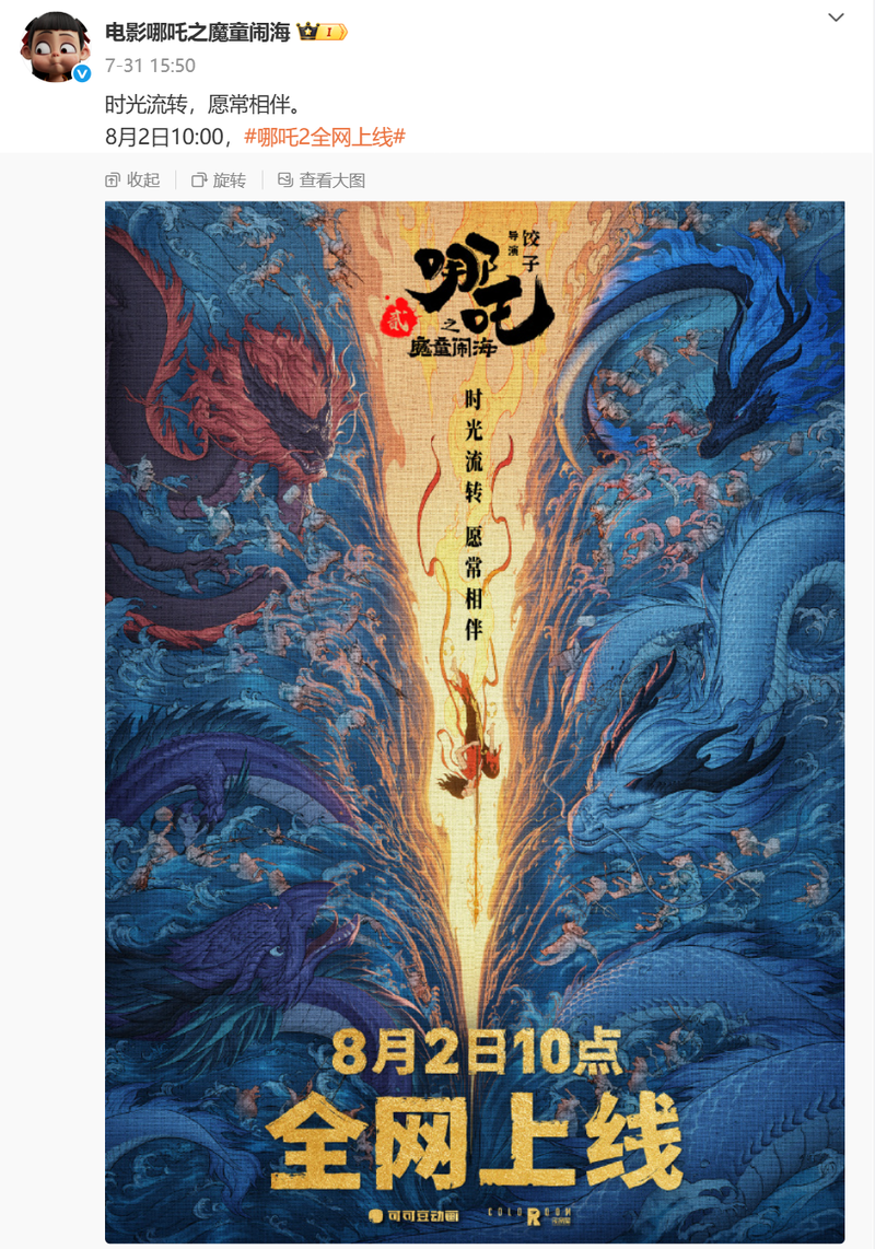 电影《哪吒之魔童闹海》官微此前发图宣布,电影将于8月2日10点全网上线,并配文“时光流转,愿常相伴”。