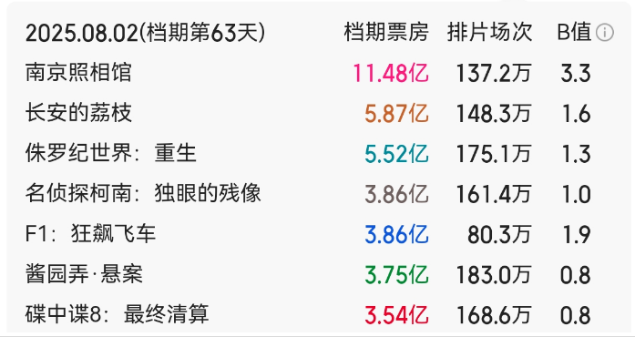 其中,《南京照相馆》档期票房达11.48亿元,排在首位;《长安的荔枝》《侏罗纪世界:重生》分别排在第二、第三位,票房均超5亿元。