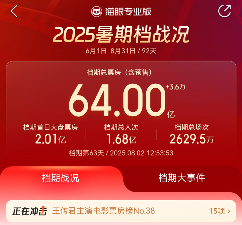 截至发稿,猫眼专业版数据显示,2025暑期档总票房(含预售)已达64亿元。