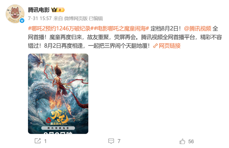 8月2日上午10:00,《哪吒之魔童闹海》(以下简称《哪吒2》)正式登陆腾讯视频、爱奇艺、优酷、B站等平台,院线转网播间隔仅33天,创国产大片最快上线纪录。