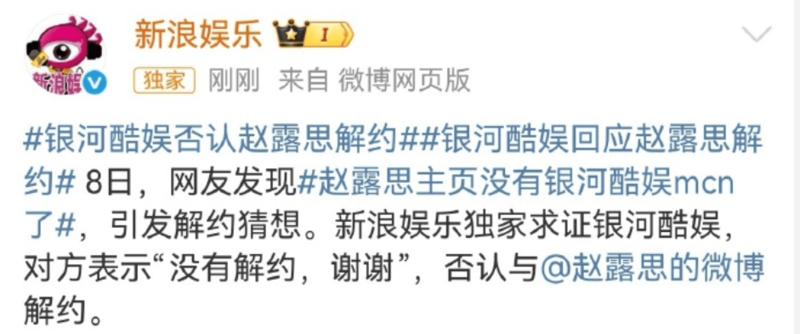 赵露思发文引发解约猜想!帐号已无银河酷娱MCN标识