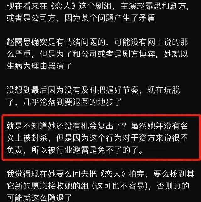 还有一点就是,赵露思选择罢演的剧《恋人》,业内坦言影响很不好,没有哪个项目敢用一个说不演就不演的演员,业内讲究契约精神,赵露思罢演导致剧方损失惨重,打工人甚至可能拿不到酬劳,而无论是跟剧组还是公司都有签署合约,赵露思说不合作就不合作,这一点对她个人影响也很致命。