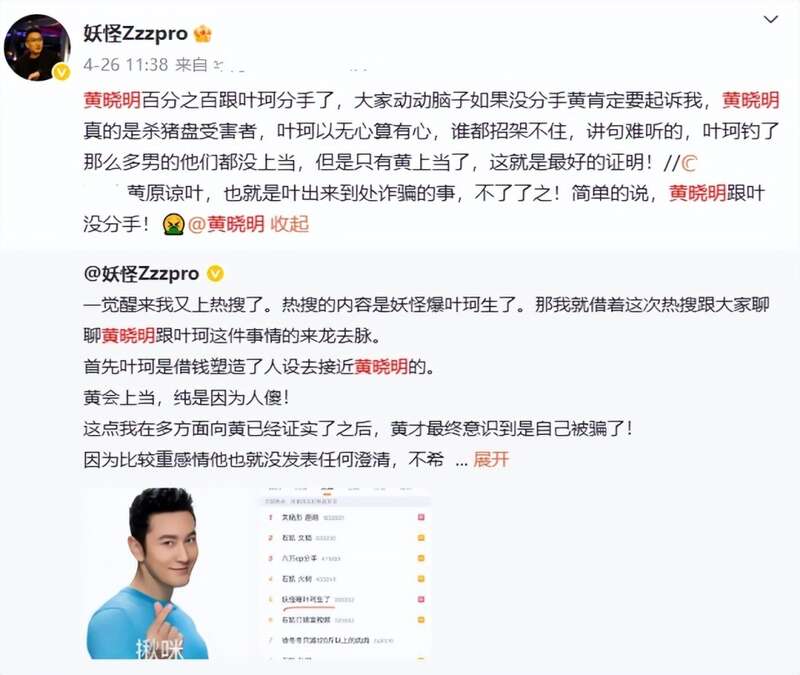 其实后面他也发文表示,黄晓明大概率与叶珂是真的分手了,还说叶珂这一招对黄晓明是“杀猪盘”。