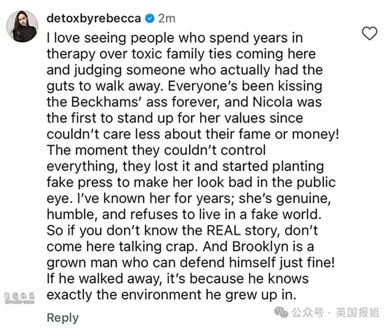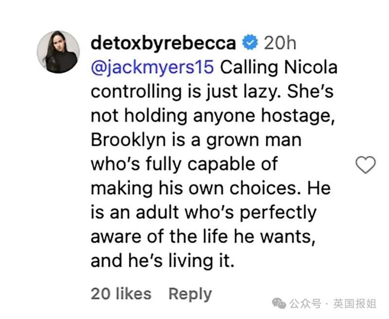 一位 Instagram 用户也为妮可拉辩护,暗示可能是布鲁克林决定不让父母参与进来,他写道: