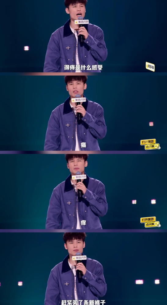 何广智讲“体检段子”时是贴脸开大,舞到了摇滚圈。他说摇滚人要是去体检,到了“肛门指检”的环节,发现得了痔疮,那一定是“痛”、“痒”,并赶紧买条“新裤子”。