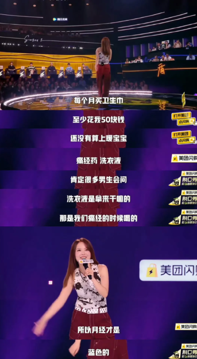 王越这一场的成功之处在于她不仅是寻求有共同经历的女性共鸣,而是站在宏观角度,将“月经”这个单一性别议题“全民化”,让没有过月经体验的男生也能理解女性困境。