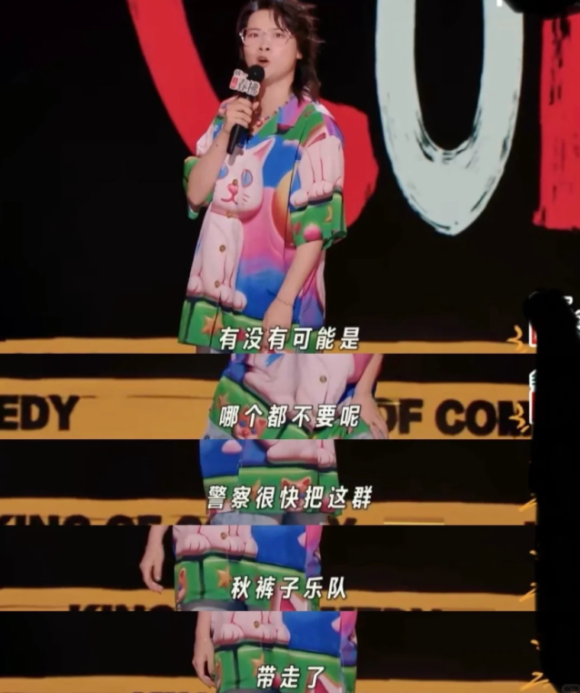 嘻哈讲在飞机上遇到“洗秋裤”的奇葩旅客时也cue到了,说警察过来把这群“秋裤子乐队”带走了。嘻哈没有硬cue“新裤子乐队”,但结合段子里的事件,一群因为秋裤而吵架的乘客的确像“秋裤子乐队”,是高级的挪用。