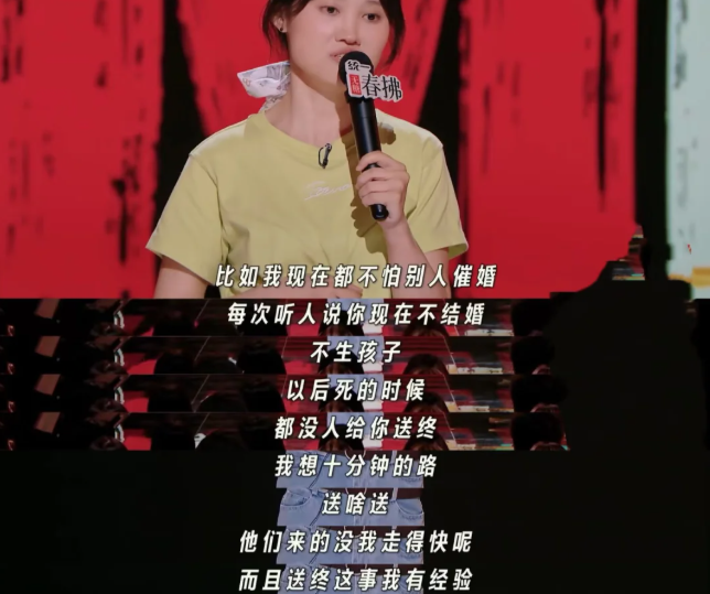 陈艾以“家住火葬场附近”为切入点,说这事让她感到人生都有了退路,也不怕被催婚说死的时候没人送终了。