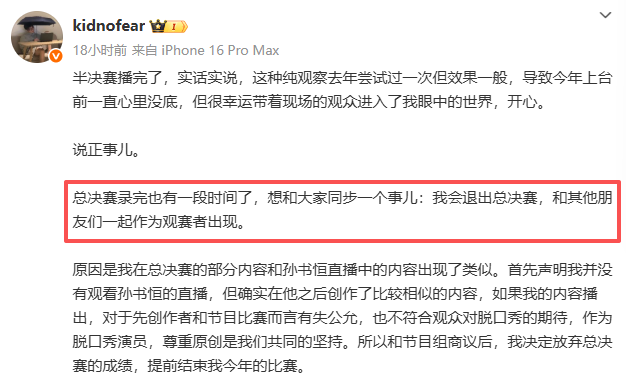 两档脱口秀节目播到现在,都快进入尾声,Kid却突然宣布退赛,因为他在总决赛中的部分内容和孙书恒直播的内容类似。