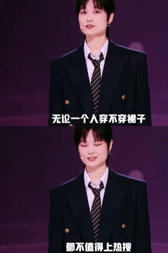 李宇春讲脱口秀时就cue了一次,借由“新裤子穿裙子都不值得上热搜”,吐槽自己穿裙子不该上热搜。但这个梗加得比较像硬cue,没有为整场表演加成。