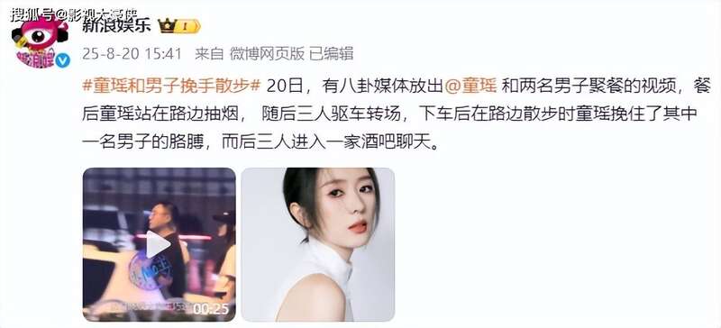 8月20日,有八卦媒体曝出一条视频,称他们在街头拍到了女演员童瑶与两名男子外出的场景。