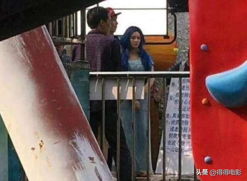 照片中的林允一头的蓝色长发,站在她身后的就是男主角艾伦。