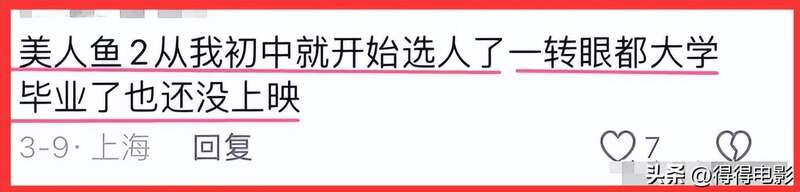 “美人鱼2从我初中就开始选人了 ,一转眼都大学毕业了也还没上映。”