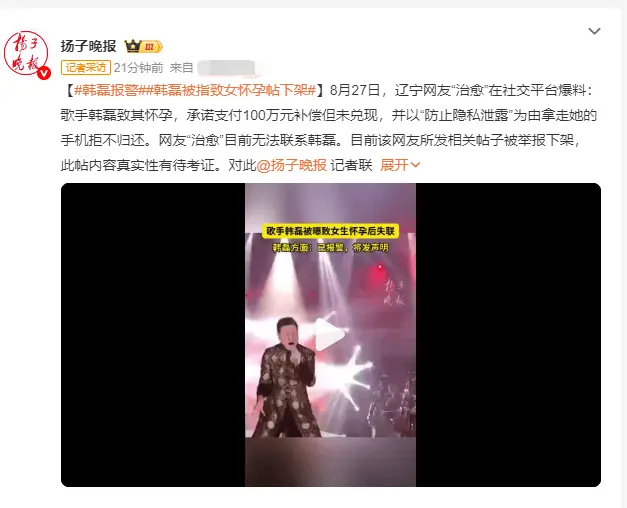 8月27日,网友“治愈”在社交平台发文爆料,称歌手韩磊导致其怀孕,此前承诺支付 100 万元补偿但未兑现,还以“防止隐私泄露”为由拿走她的手机且拒不归还,目前该网友表示已无法联系到韩磊。