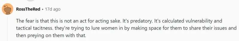 “令人担心的是,这并非单纯为了表演而表演,而带有掠夺性,那都是精心设计过的脆弱和含蓄。他们试图营造让女性倾诉问题的空间,以此吸引她们,然后再进行掠夺。”