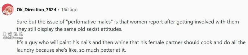 “……‘表演男’的问题在于,很多女性表示,交往之后,他们依旧会展现出老掉牙的性别歧视态度。一个男的可能自己涂着指甲油,却抱怨女朋友应该负责做饭洗衣,因为‘她更加擅长这些’。“