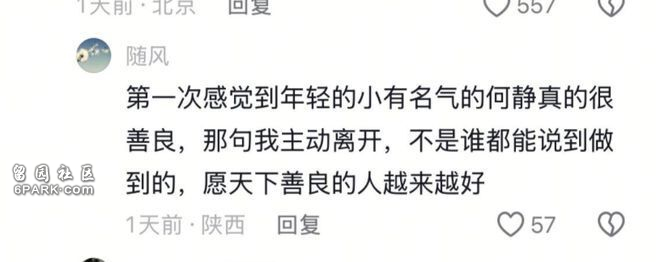 “第一次感觉到年轻的小有名气的何静真的很善良,那句主动离开,不是谁都能说到的,愿天下善良的人越来越好!”