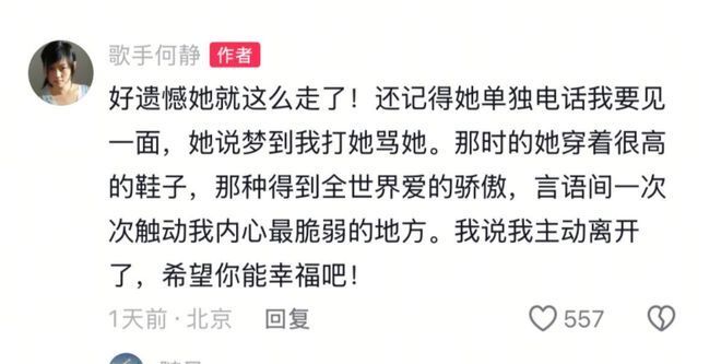 “好遗憾她就这么走了!还记得她单独电话我要见面,她说梦到我打她骂她。那时的她穿着很高的鞋子,那种得到全世界爱的骄傲,言语间一次触动我内心最脆弱的地方。我说我主动离开了,希望你能幸福吧。”