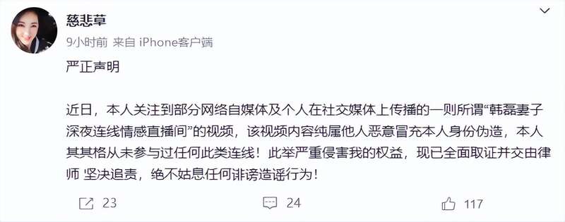 8月28日深夜,其其格通过个人社交账号发声明回应,指所谓“韩磊妻子深夜连线情感直播间”的视频,纯属他人恶意冒充本人身份伪造,本人其其格从未参与过任何此类连线,此举严重侵害我的权益,已全面取证并交由律师,坚决追责,绝不姑息任何诽谤造谣行为。