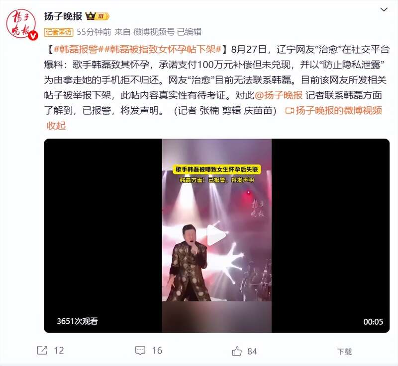 据悉,韩磊近日被网友“治愈”控诉,出轨女方怀孕后失联,此前曾承诺支付女方100万,结果拿走女方手机后玩失踪。“治愈”还发布多段韩磊的视频以及录音,但很快被全面下架,账号也注销了。