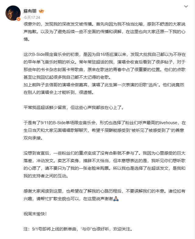 对此,苏有朋发文:“这是音乐会,不是合影会。我卖艺不卖身。不爱音乐的人别来了,枉费伙伴们不计成本办单场。谢谢哦。”