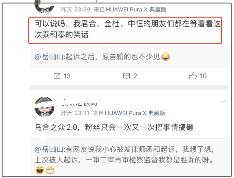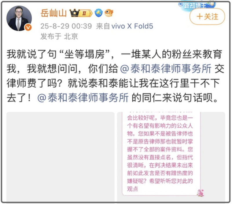 更大的乐子还在后面,律师岳屾山当时发了一条动态“坐等塌房”,没有指名道姓,结果虞书欣的粉丝就急眼了开始私信抨击岳律师,还说虞书欣父亲委托的律所能让岳律师在这行干不下去,属实是倒反天罡了。