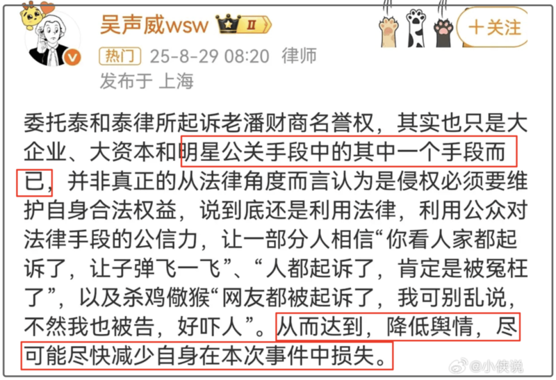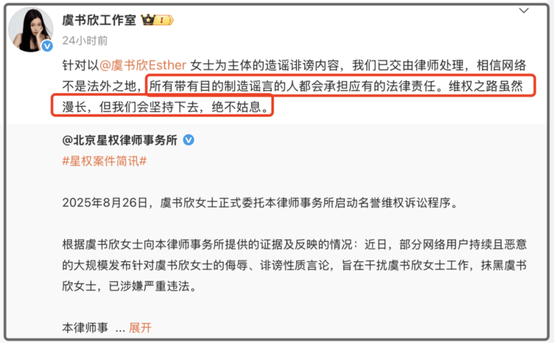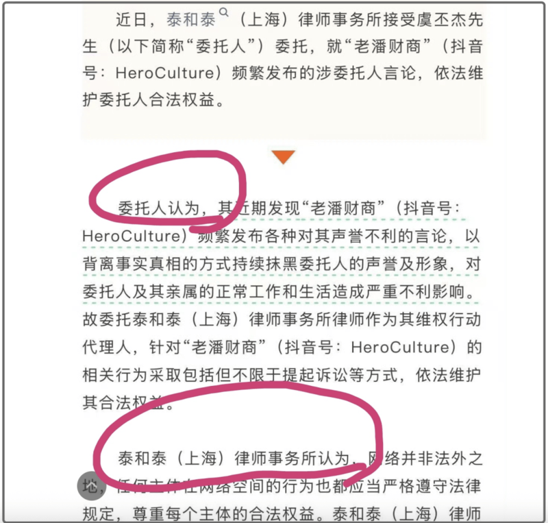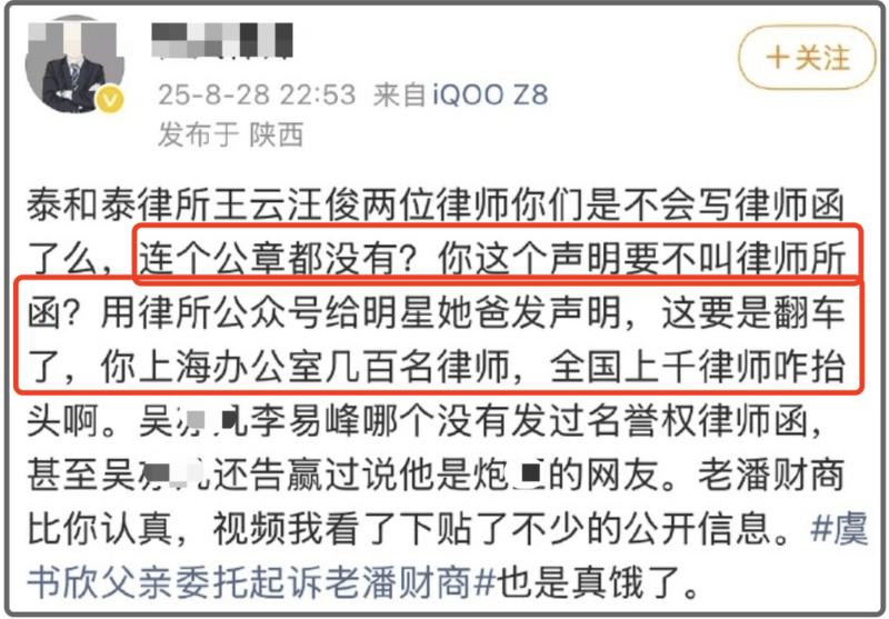 虞书欣这边没有起诉老潘,但虞书欣父亲却起诉了。只是接受虞书欣父亲委托的这家律所,立刻成为了律师圈的乐子,比如发布的声明仅仅是一篇文章,不是律师函,连公章都没有,更不具备法律效力。而且文章里律所还谨慎地把委托人和律所立场切分开来叙述,主语是“委托人认为”,不是“律所立场认为”。