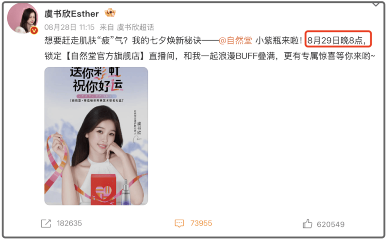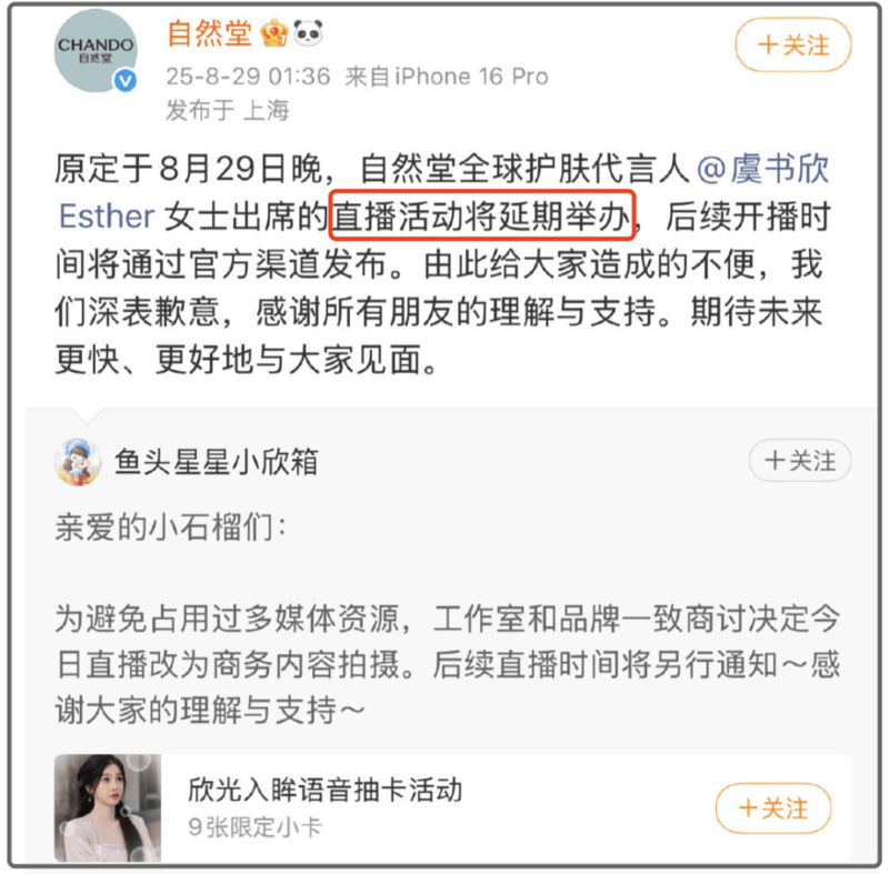 不仅如此,虞书欣先前预告的一场品牌直播,也被紧急叫停,品牌方连夜发文称活动延期举办。