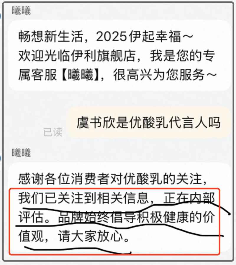 有网友赶紧去问客服,客服的回应是,企业已经关注到相关信息,正在内部评估,且品牌始终倡导积极健康的价值观,也就是说,虞书欣风波闹到现在,在企业看来,已经与积极健康的价值观不符了。