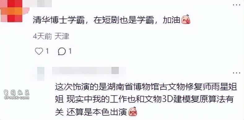 这部短剧讲述围棋文化,她饰演湖南省博物馆古文物修复师。现实生活中,袁博士的工作,和文物3D建模复原算法有关,算是本色出演。