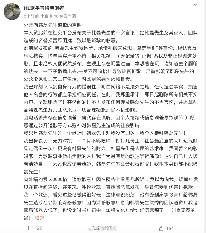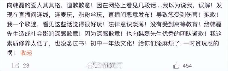 据悉,女网友“治愈”在27日发文控诉与韩磊存在不正当关系,韩磊在她怀孕后承诺支付100万,但很快玩“人间失踪”,她在29日发文道歉,自称发布内容与事实严重不符,是闹着玩,严重影响了韩磊的形象,深感愧疚和自责。自曝自己修养低,只有初中文化,因为崇拜韩磊才捏造造谣。