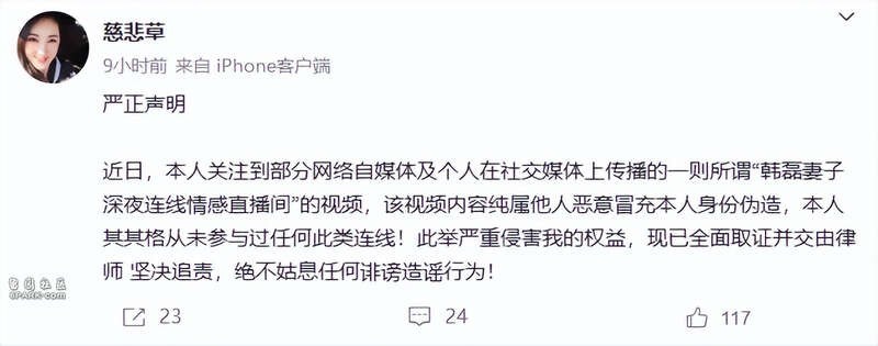 韩磊工作室发声明澄清,已经起诉了许某女(“治愈”),然后音乐工作室表示已经对相关侵权内容全面取证,要求网友删除不实信息。