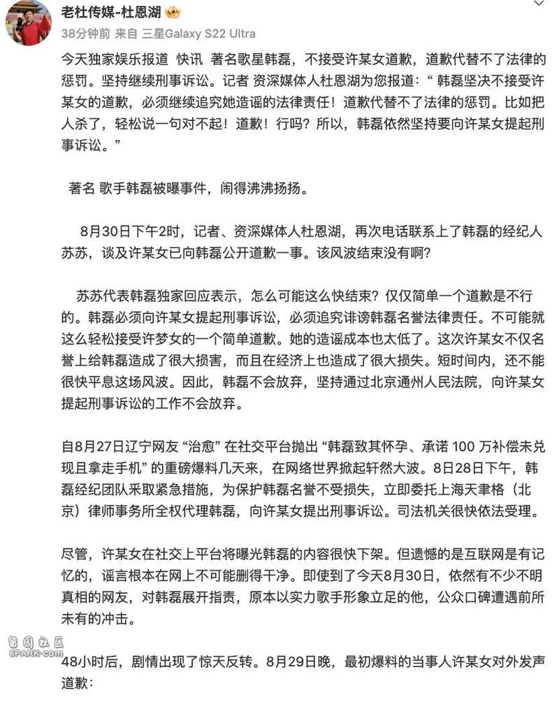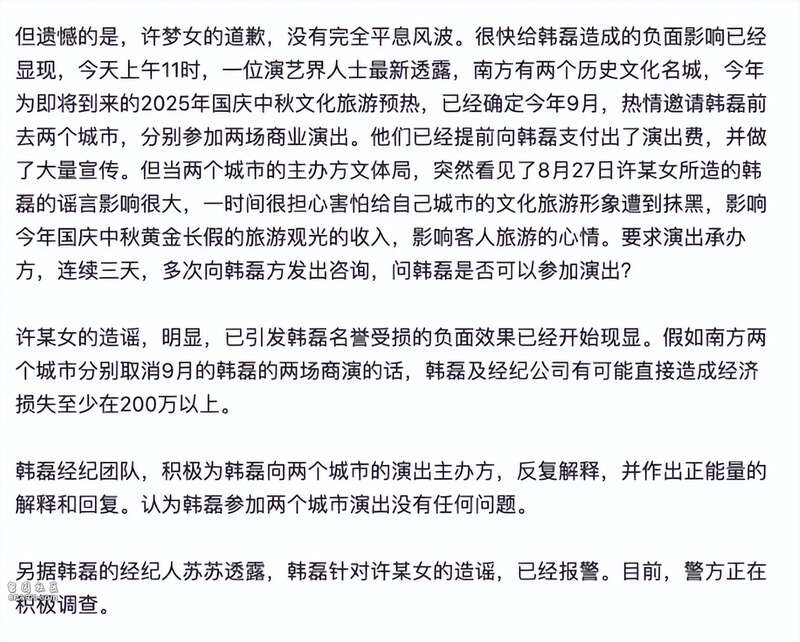 8月30日,娱记杜恩湖采访韩磊的经纪人苏苏,苏苏表示此事不可能那么快结束,简单一个道歉是不行的,必须提起刑事诉讼,指女方造谣成本太低,对韩磊造成名誉和经济损失,所以不会撤诉。