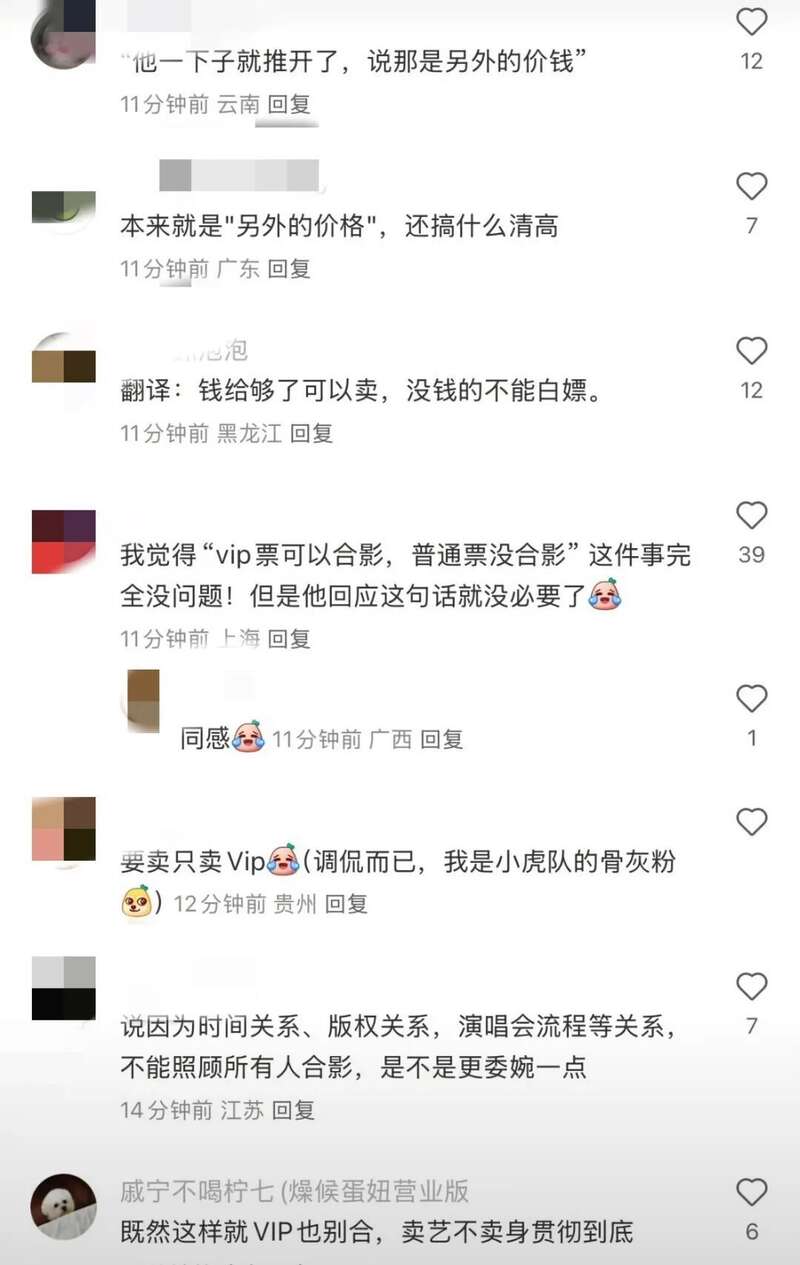 不过作为音乐会演出,“卖艺不卖身”这五个字也的确并不恰当。一场对外售票的商业演出,同时也开放了部分VIP的合影权益,那些没有买到VIP票的粉丝想要和偶像合影,这并不涉及什么“卖艺不卖身”,只是单纯想跟偶像留个纪念了,上升到“卖艺不卖身”,显然是过度理解和过度反应了。