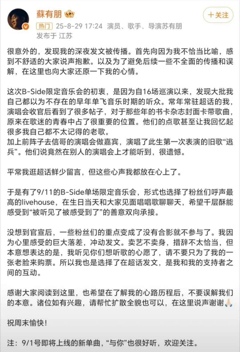 当苏有朋意识到自己的不当言论被热议后,立刻深夜发文致歉,称大家误会他的意思了,本意想表达的是,他听见了歌迷想听歌的心愿,但请不要只为了他的一张老脸来购票。全文如下: