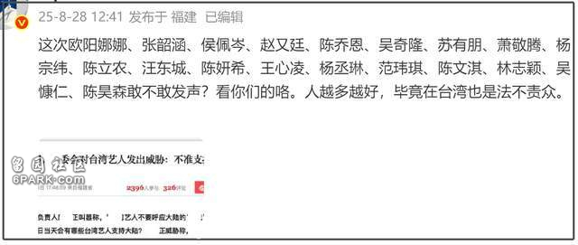 而台湾省名嘴对此非常不满,直接开麦吐槽,如果这些艺人配合转发是希望两岸和平统一,这到底有什么问题?而且像欧阳娜娜、张韶涵等人虽然知名度很高,但也不如周杰伦,有本事办周杰伦、五月天试试?“我笑你们不敢”。